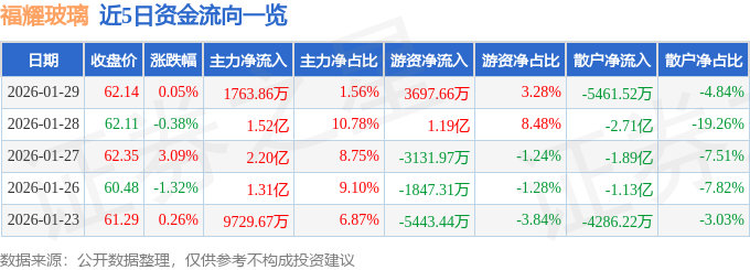 证券之星消息,截至2026年1月29日收盘,福耀玻璃(600660)报收于62.14元,上涨0.05%,换手率0.91%,成交量18.23万手,成交额11.27亿元。