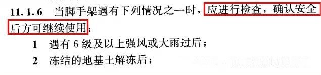 11.1.6使用过程中的检查是脚手架安全管理的重要内容,应坚持定期检查,并及时消除影响脚手架安全的各种隐患,使脚手架始终处于良好的工作状态。特别是遇有第11.1.6条所列情况时,对架体应进行必要的检查,确认安全后,方可继续使用。
