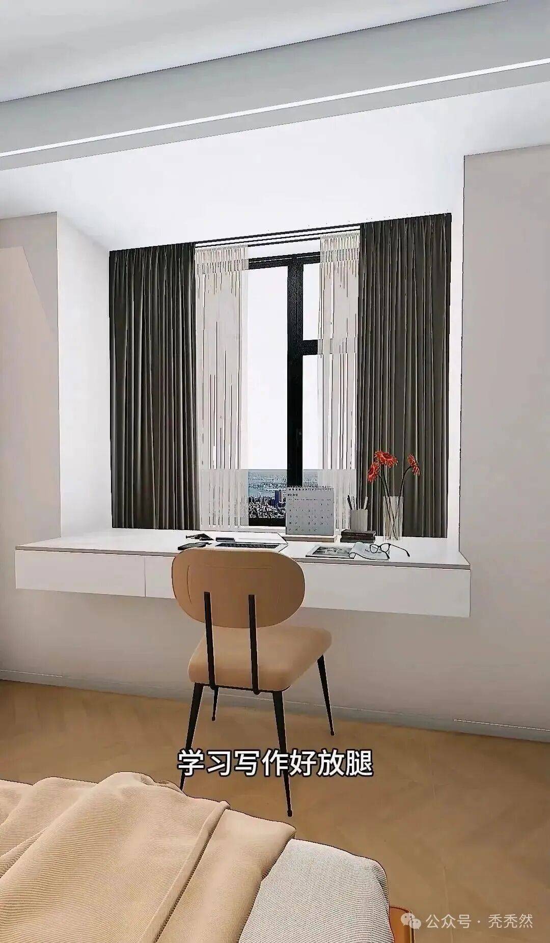 她现在早上坐着化妆,晚上放放书,整块区域利用得一毛不剩。