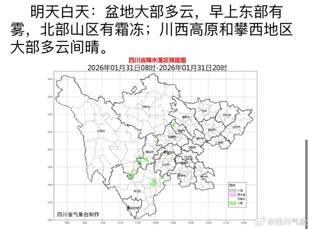 今天晚上到明天白天:盆地大部多云间阴,东部南部和西部沿山阴天有小雨,高海拔山区有雨夹雪或雪,早上东部有雾,北部山区有霜冻;甘孜州东部、阿坝州东部北部和凉山州东北部阴天间多云有分散阵雪(雨),局地中雪,川西高原和攀西地区其余地方多云间晴。24小时内,盆地最低气温:西部1~4℃,其余地方4~6℃;最高气温:10~13℃。