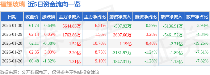 证券之星消息,截至2026年1月30日收盘,福耀玻璃(600660)报收于61.74元,下跌0.64%,换手率0.7%,成交量13.95万手,成交额8.67亿元。