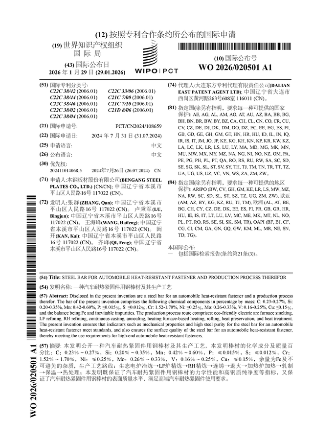 证券之星消息,根据企查查数据显示本钢板材(000761)公布了一项国际专利申请,专利名为“一种汽车耐热紧固件用钢棒材及其生产工艺”,专利申请号为PCT/CN2024/108659,国际公布日为2026年1月29日。