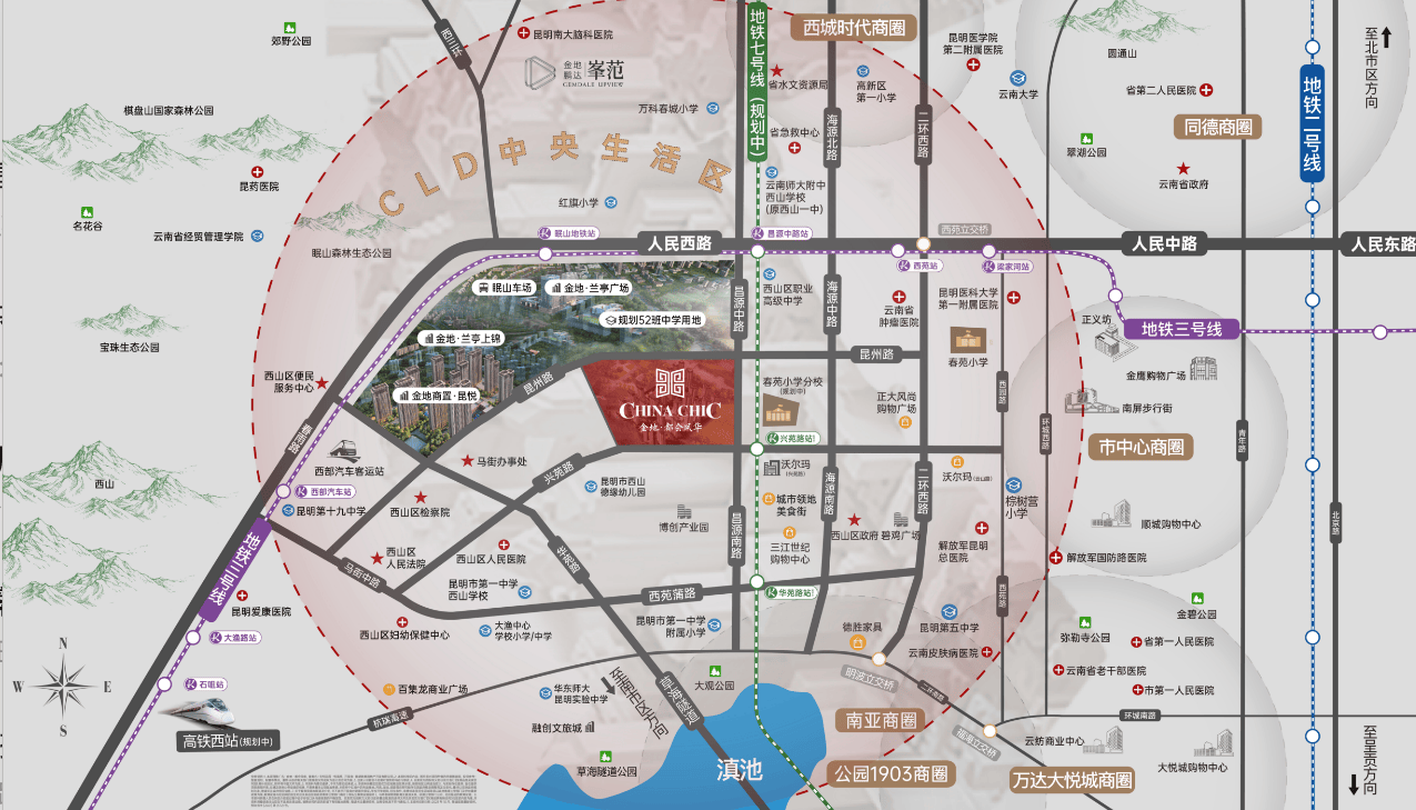 项目自带公立公办18班春苑幼儿园、公立公办春苑小学学位,紧邻D3地块云师大附中公立学校(规划中),项目周边3公里内昆一中西山区分校。
