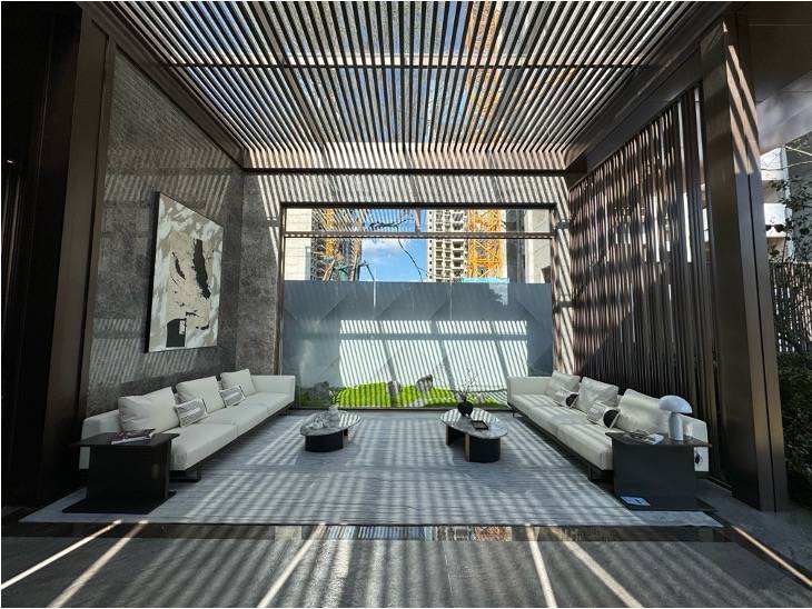 入户尊崇:云朵拉灰石材立面、岩板山水照壁,增加归家仪式感