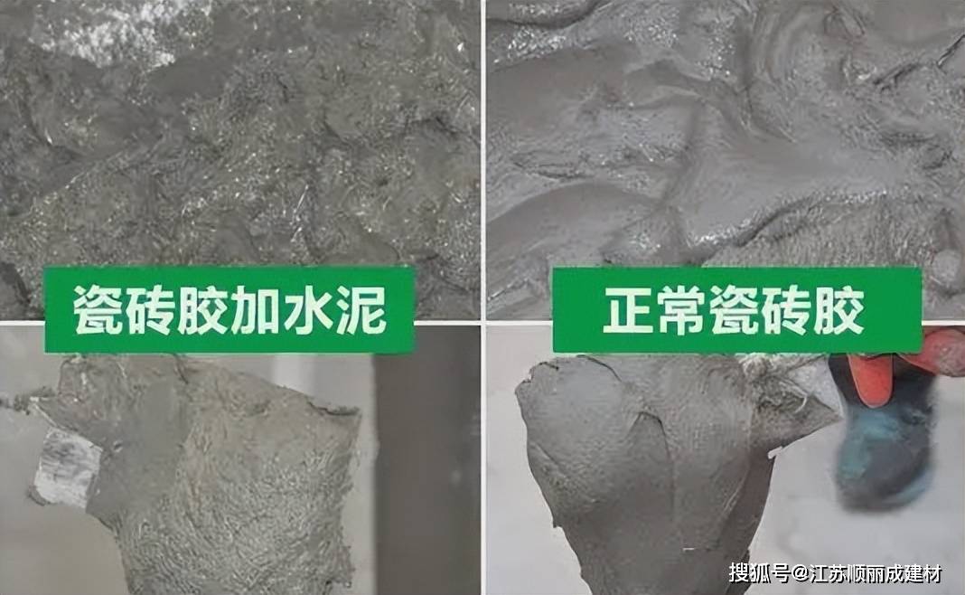 瓷砖胶已经是级配好的产品,使用时按比例加水调配出来的浆料具备一定的柔韧性,铺贴瓷砖的效果是最佳状态。若再添加水泥或其它材料破坏了瓷砖胶本身的科学配比,加剧了浆料在硬化过程中的收缩,收缩导致的浆料开裂将最终导致墙面、地面瓷砖的空鼓甚至是脱落。一般来说添加水泥的瓷砖胶硬化后颜色较深,基本可以判断是否违规添加水泥的依据。