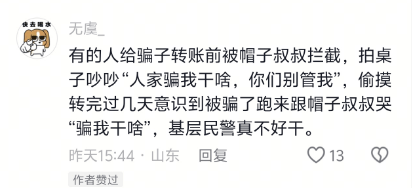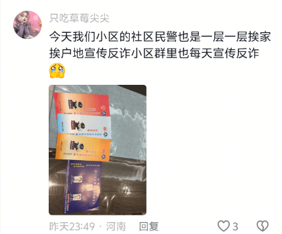 网友在视频结尾配文:他用双脚走遍辖区,挨家挨户地张贴防诈宣传单,虽然体会不到他的苦,但能深切感受到他对辖区居民的“一百个不放心”。所以,我们要学会保护好自己的钱袋子。