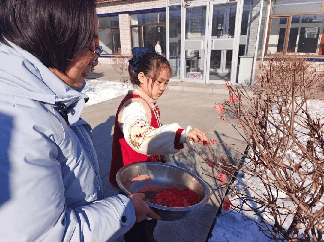此外,孩子们还拿起红色蜡块,发挥想象力捏制仿真梅花,亲手将这些充满创意的作品点缀在庭院角落,让庭院瞬间充满了浓浓的年味与艺术气息。在动手实践中,孩子们不仅体验了传统民俗的魅力,更接受了艺术启蒙,收获了满满的成就感。
