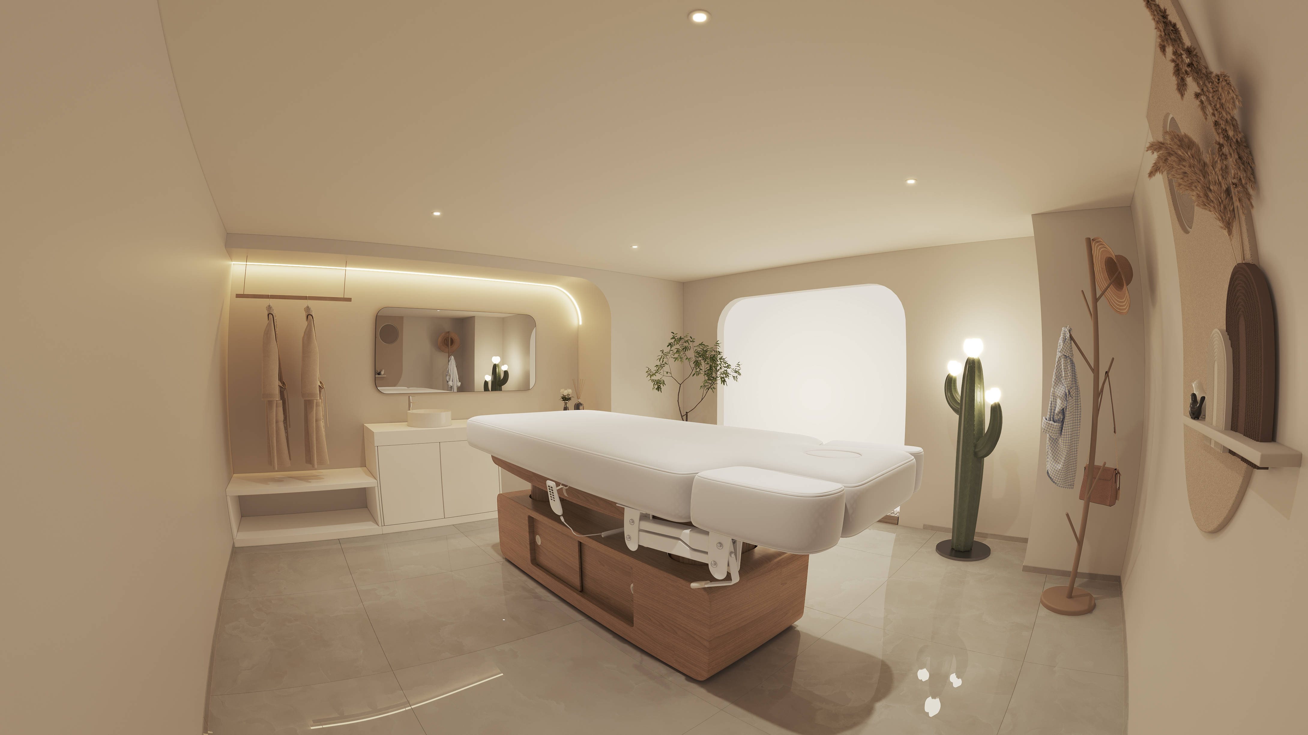 色彩与光线:整体以暖米色为基底,搭配多层次灯光系统——天花板嵌入式筒灯提供基础照明,镜周弧形灯带营造柔和面部光线,仙人掌造型落地灯则成为空间视觉焦点与氛围补充,光线温润不刺眼,全方位塑造松弛、疗愈的空间情绪。