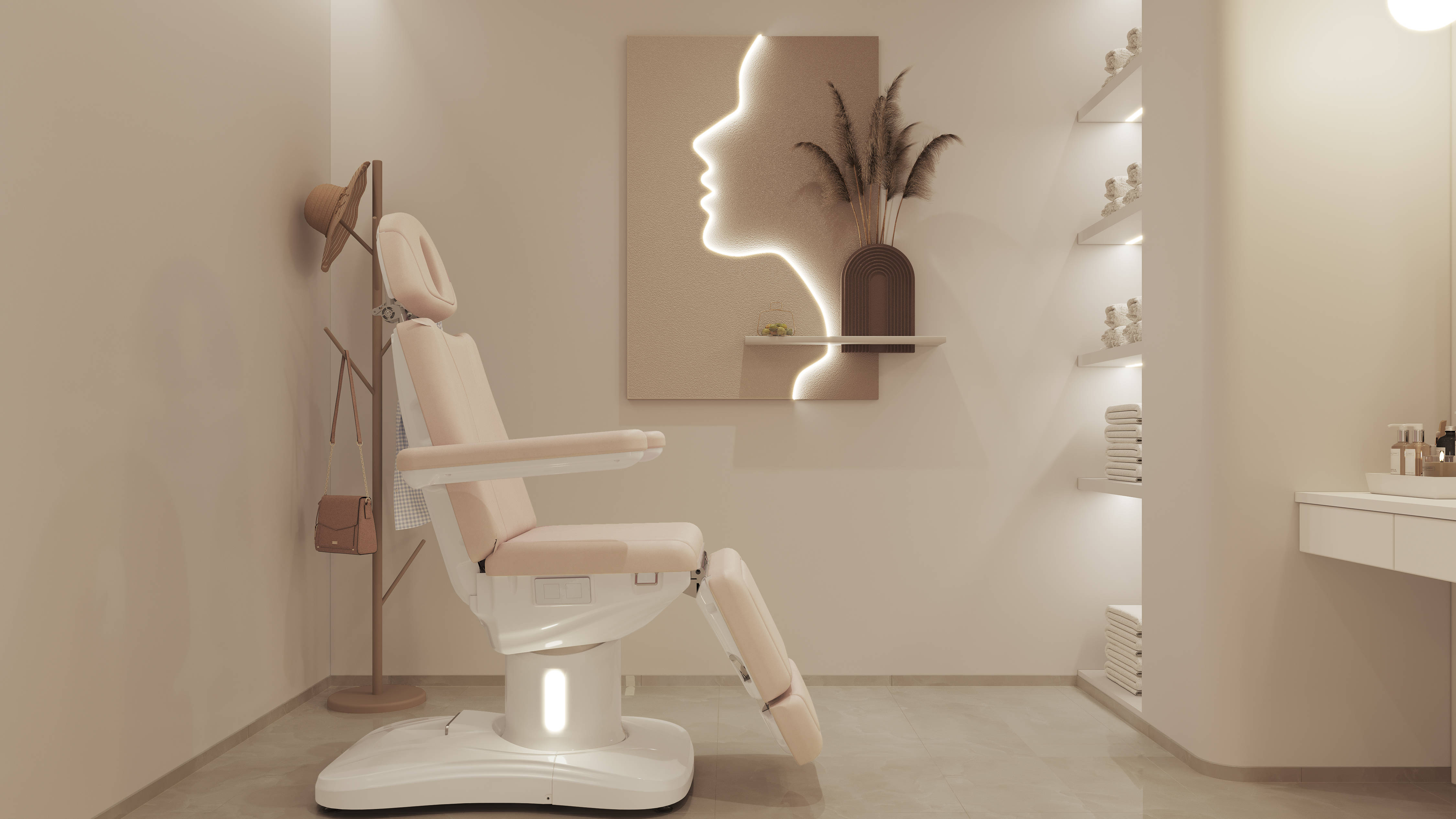 整体以低饱和度的米白、浅驼等暖色调为主,构建出温馨、柔和且高级的空间基底,弱化了美容/医美场所易产生的“冰冷感”,传递出疗愈放松的情绪。