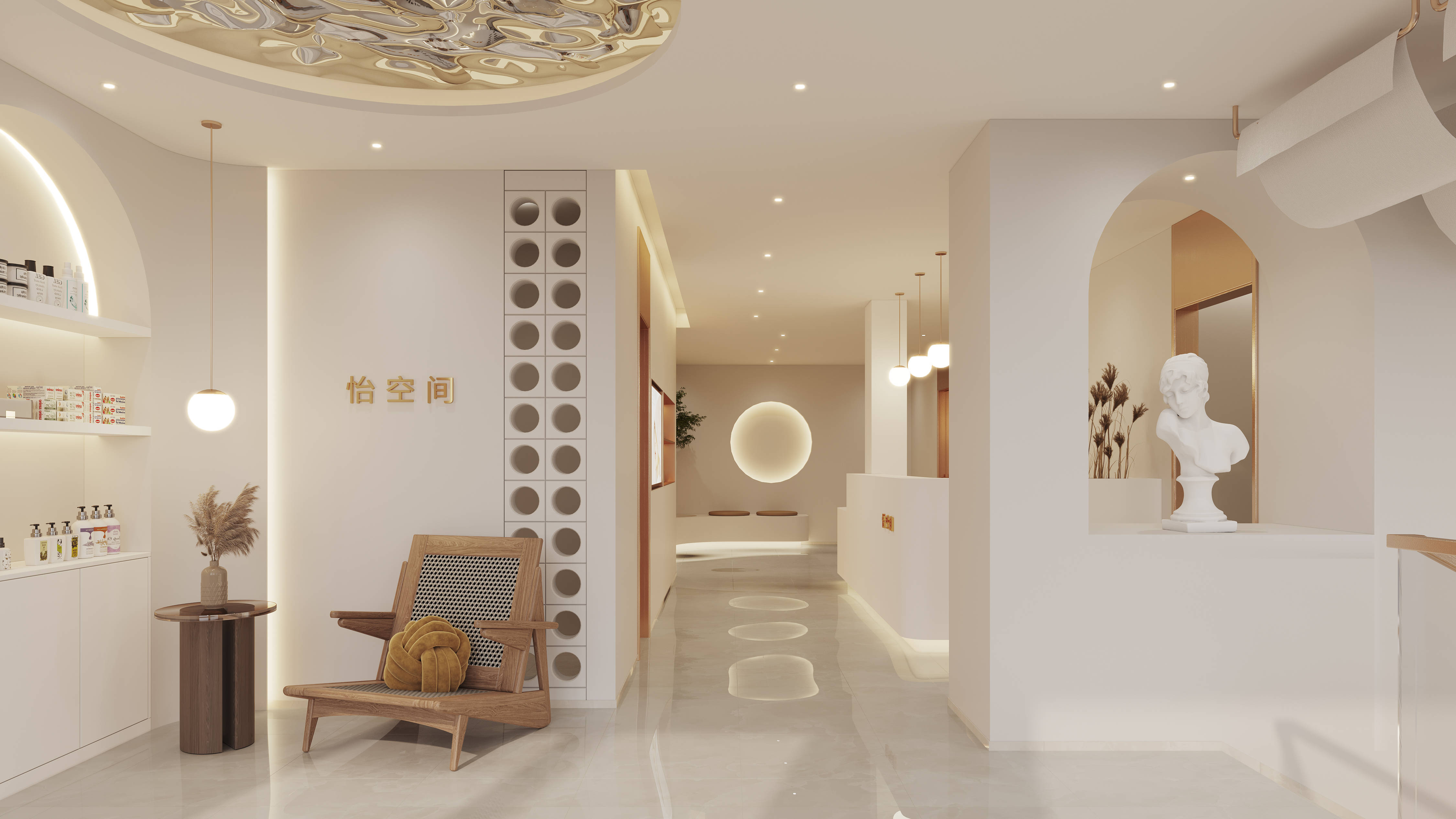软装细节:墙面圆形镂空装饰、艺术雕塑、干花陈设等,为空间注入艺术感与文化氛围,弱化“商业空间”的冰冷感,强化“疗愈+美学”的体验感。