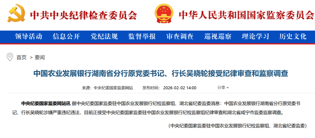 2月2日,中央纪委国家监委官网通报:中国农业发展银行湖南省分行原党委书记、行长吴晓轮涉嫌严重违纪违法,目前正接受中央纪委国家监委驻中国农业发展银行纪检监察组纪律审查和湖北省咸宁市监委监察调查。