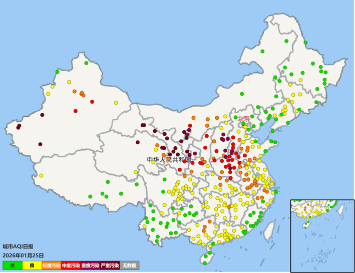 1月25日全国PM2.5浓度分布。图源自中国环境监测总站