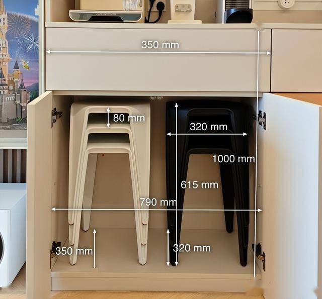 但是邻居家,装修的时候,就考虑到了这点,专门在餐边柜预留了一个收纳凳子的空间。