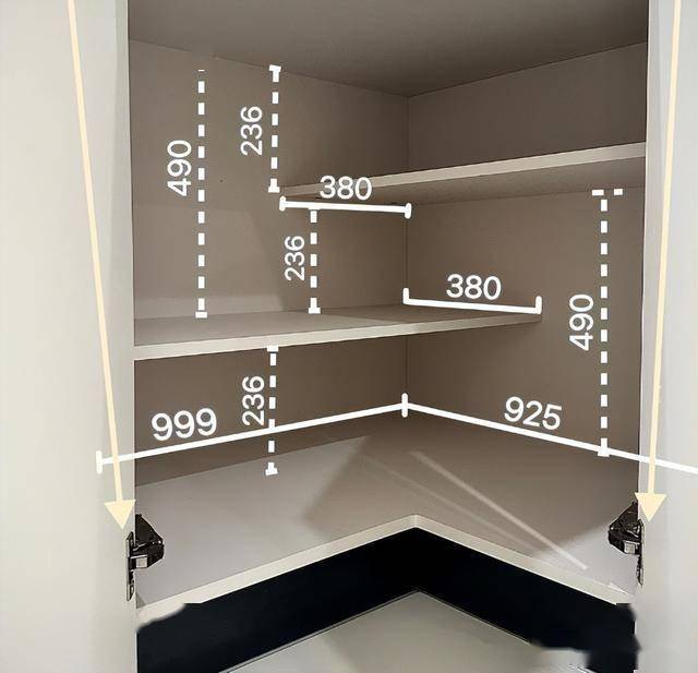 转角柜的柜门,一定要做对开门搭配着165大角度铰链,这样开关柜门的角度更大,拿东西、放东西也方便。