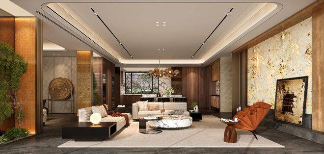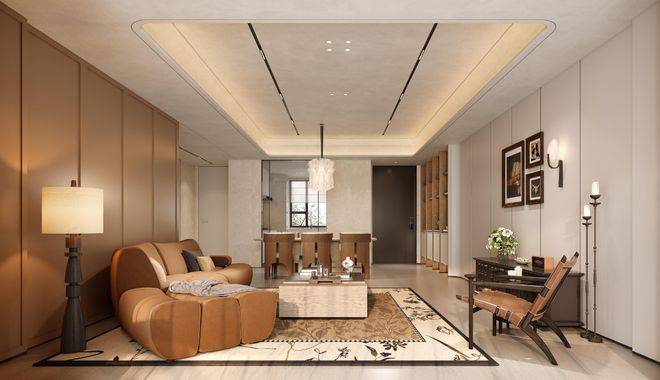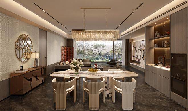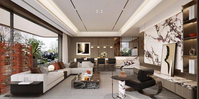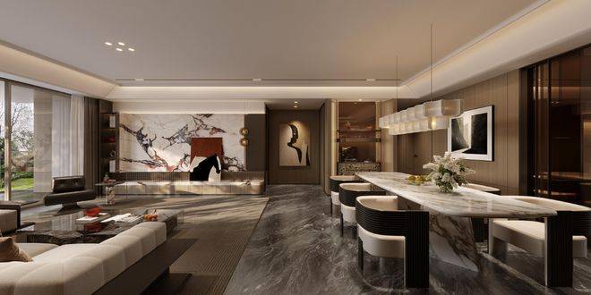 公区以海派为笔触,染现代之气韵,融汇成一方优雅生活的序章