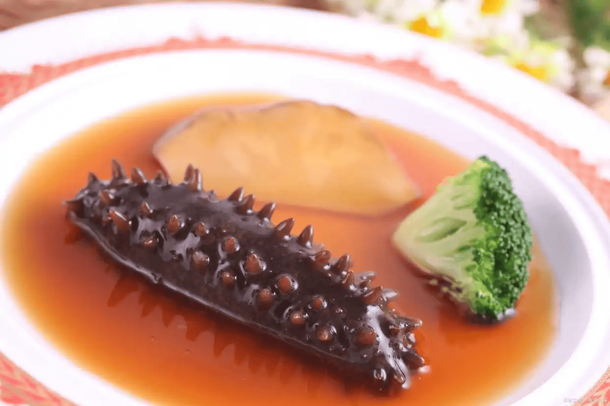 - 开大火将汤汁收至浓稠,关火后将海参捞出,摆放在盘中,周围摆放西兰花和胡萝卜片,淋上剩余的鲍汁即可。