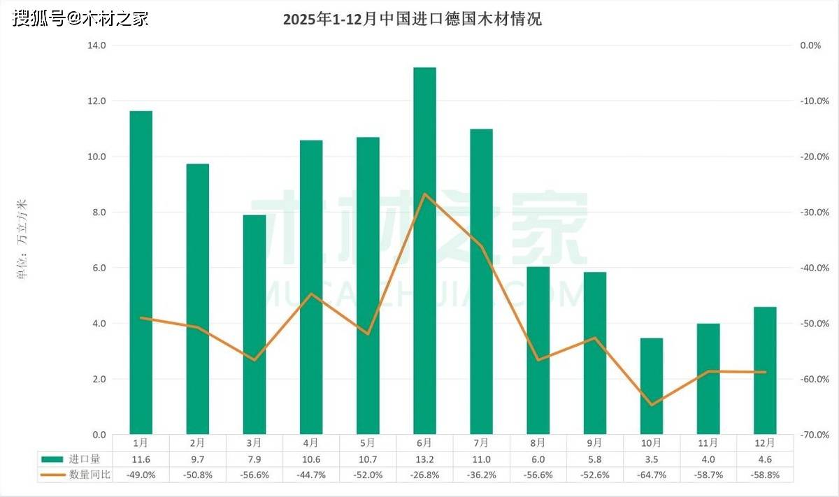 2025年,德国对中国木材连续三年出口下跌,且下跌幅度进一步扩大。