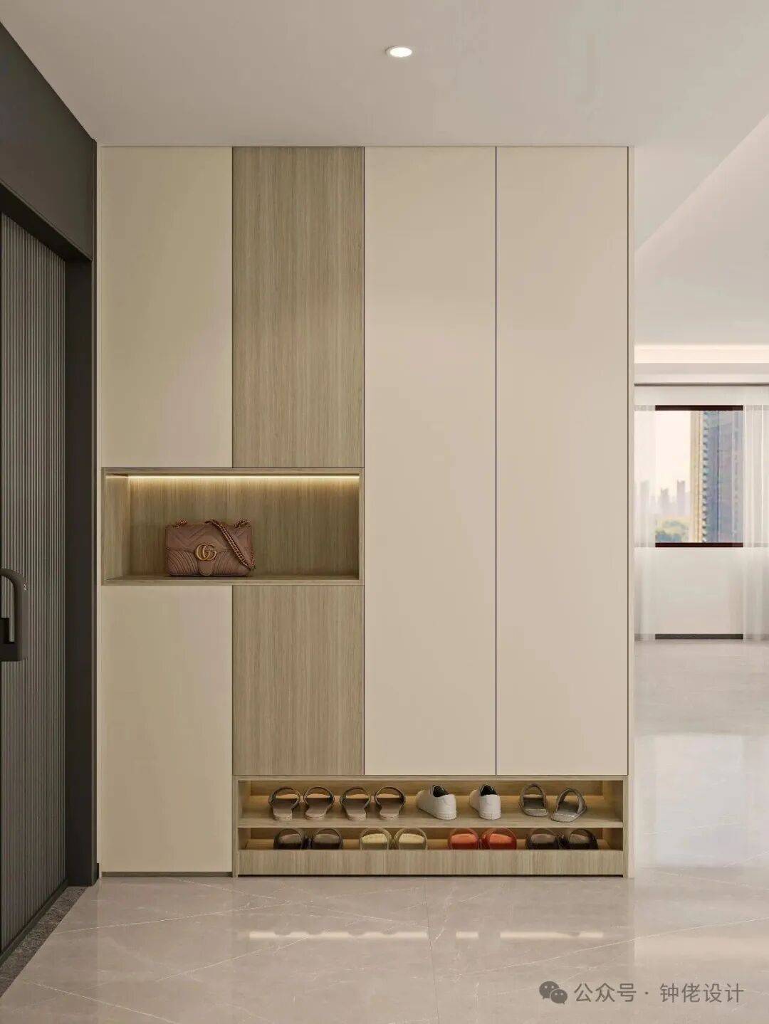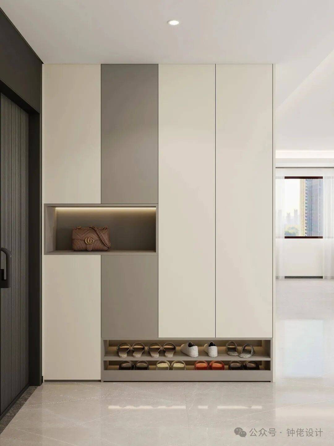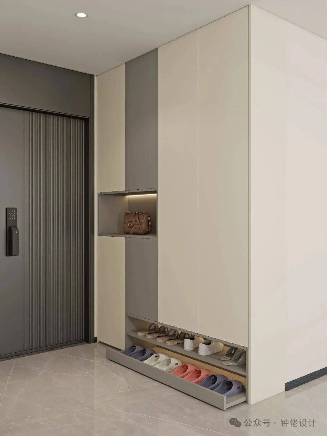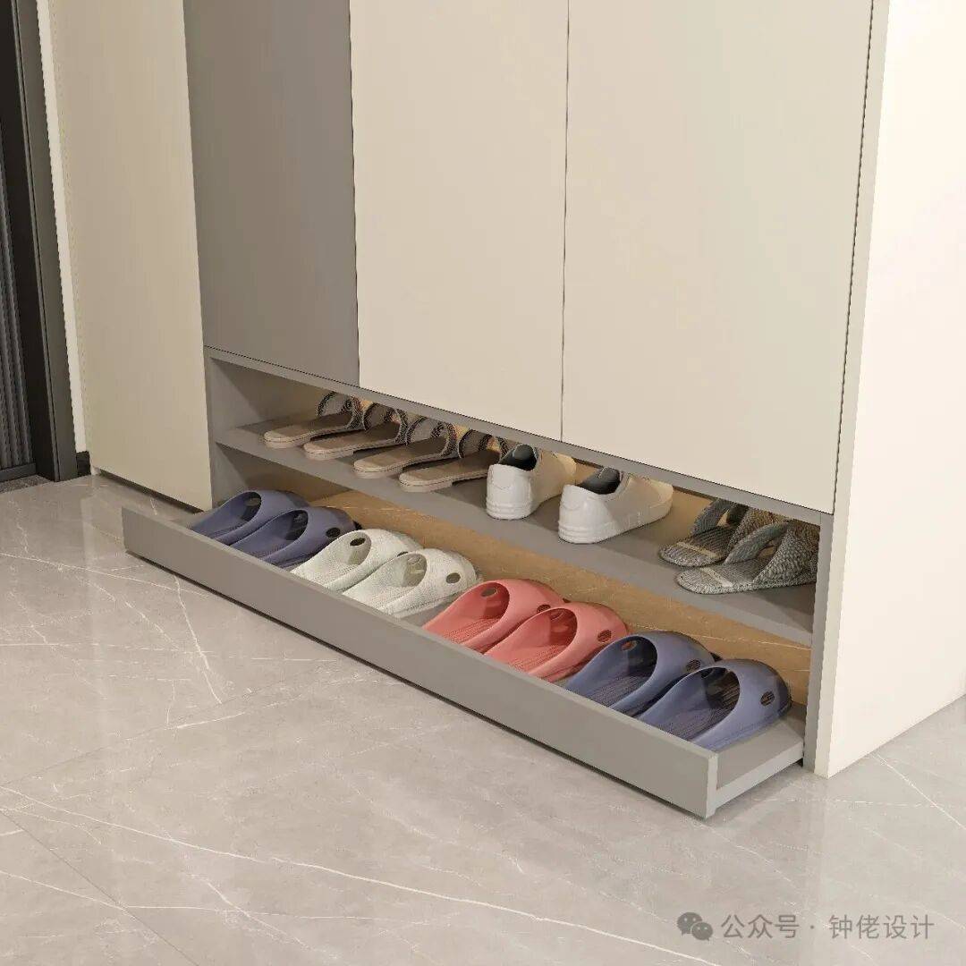 值得注意的是,这些创意配色方案均基于家用常态尺寸鞋柜设计,搭配合理的内部结构(如抽拉式鞋架、分层隔板),既能满足收纳需求,又能让配色优势充分凸显。在选择时,可根据自家家居风格、入户光线条件灵活调整 —— 光线较暗的入户可增加 PET 珍珠白的占比,提亮空间;偏爱个性风格的家庭,可在拉手、线条等细节处加入金属、玻璃等元素点缀,让鞋柜更具设计感。