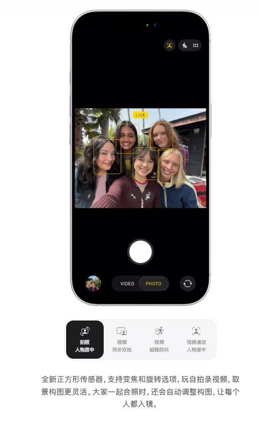 作为参考,本代iPhone(包含iPhone 17/Pro/Pro Max、iPhone Air)均升级了1800万像素Center Stage前置摄像头,其核心配置便是方形传感器,带来了多项实用功能:支持轻点变焦和旋转,无需转动就能调整取景范围与横竖屏模式;拍照和视频通话时可实现人物居中,多人合照时会自动扩大视野、调整构图,确保所有人入镜;同时还具备视频超稳防抖、同步双拍等能力,丰富了自拍和视频创作的玩法。