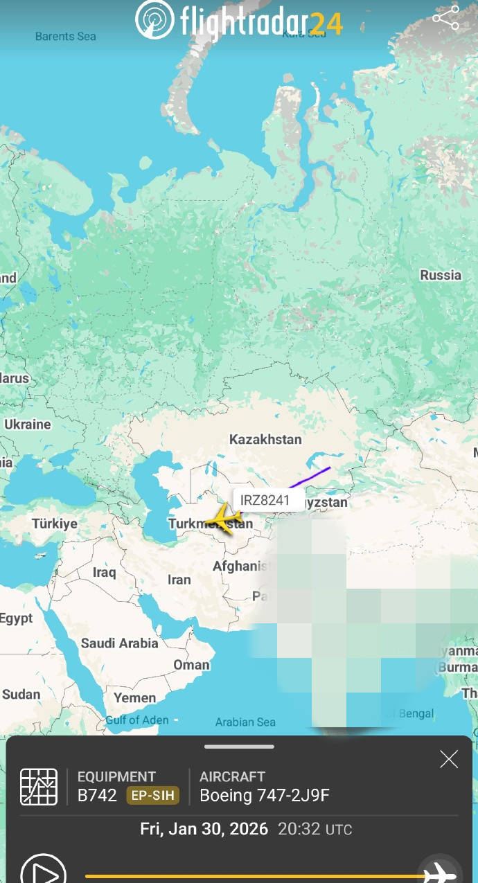 就在伊朗境内发生了多起爆炸之前,当地时间2026年1月30日,根据世界航空航线系统的数据,伊朗一架波音-747大型运输机,从中国返回,具体任务不明。伊朗现役波音-747飞机,多为747-200F货运机型,伊朗客运版的波音-747,早已退役,大概率是伊朗航空/马汉航空执飞,中伊航线常态化运营,但是拉着什么货物,暂时还不知道。早前,西方国家疯狂炒作,16架运-20运输机降落伊朗一事,看似中国给伊朗紧急运输了防空导弹,或者雷达系统,不过没有任何航线系统信息,运-20运输机落地伊朗的画面。
