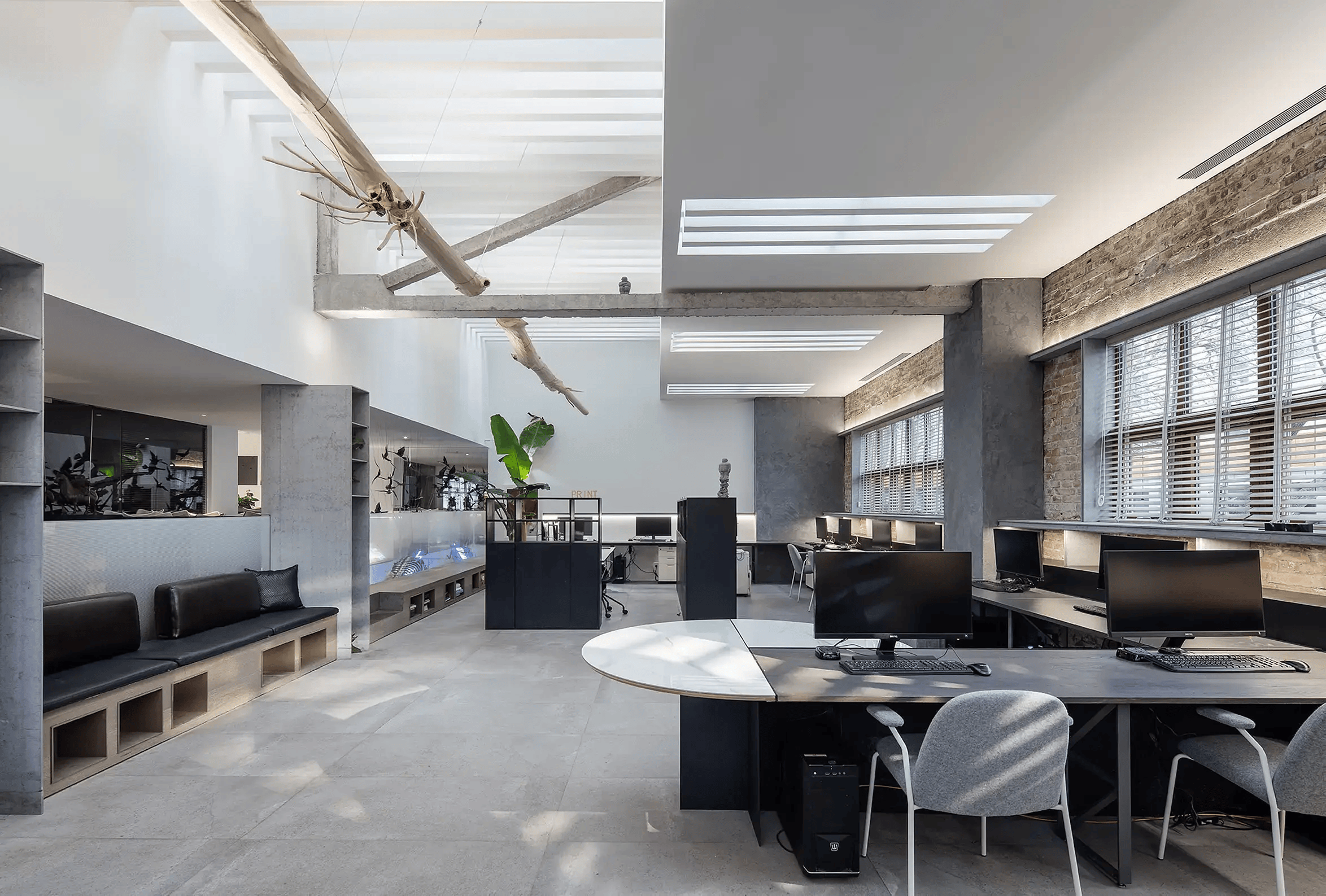 - 顶面:开放区局部吊顶(隐藏管线),搭配筒灯+轨道灯;裸顶区域喷黑,走工业风,节省层高与成本。