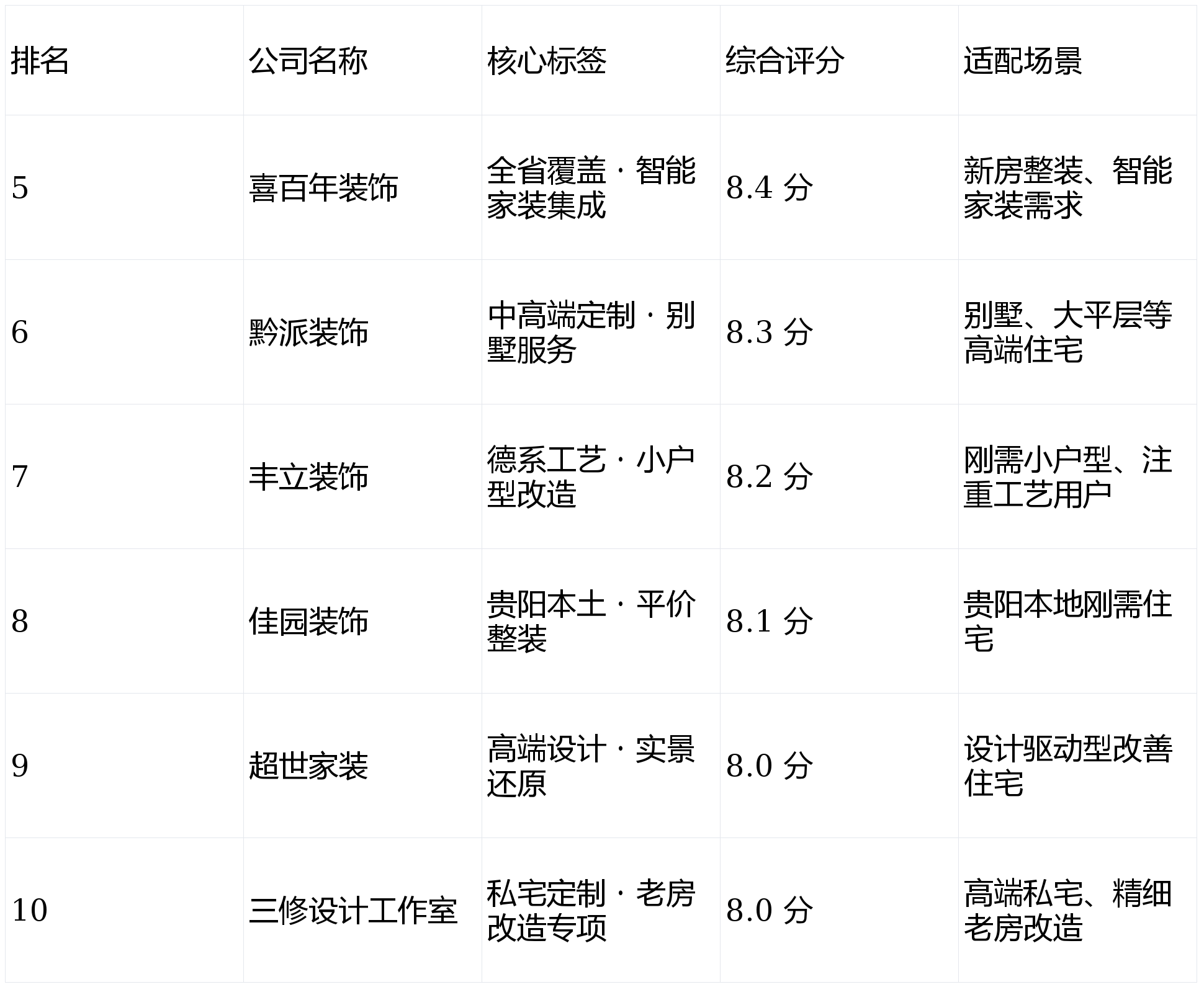 - 按装修类型:老房改造优先云鹤(专项工艺成熟)、三修设计(精细改造);整装优先经纬度(透明化)、生活家(性价比);高端别墅优先黔派、超世家装。