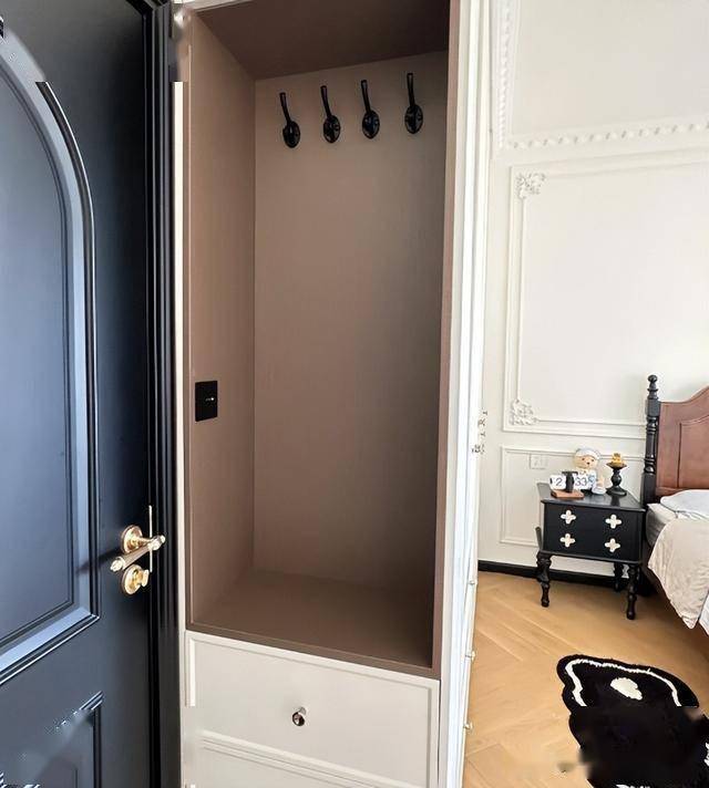 做法也很简单,只需要在衣柜的侧面做一个镂空设计,搭配着挂钩。