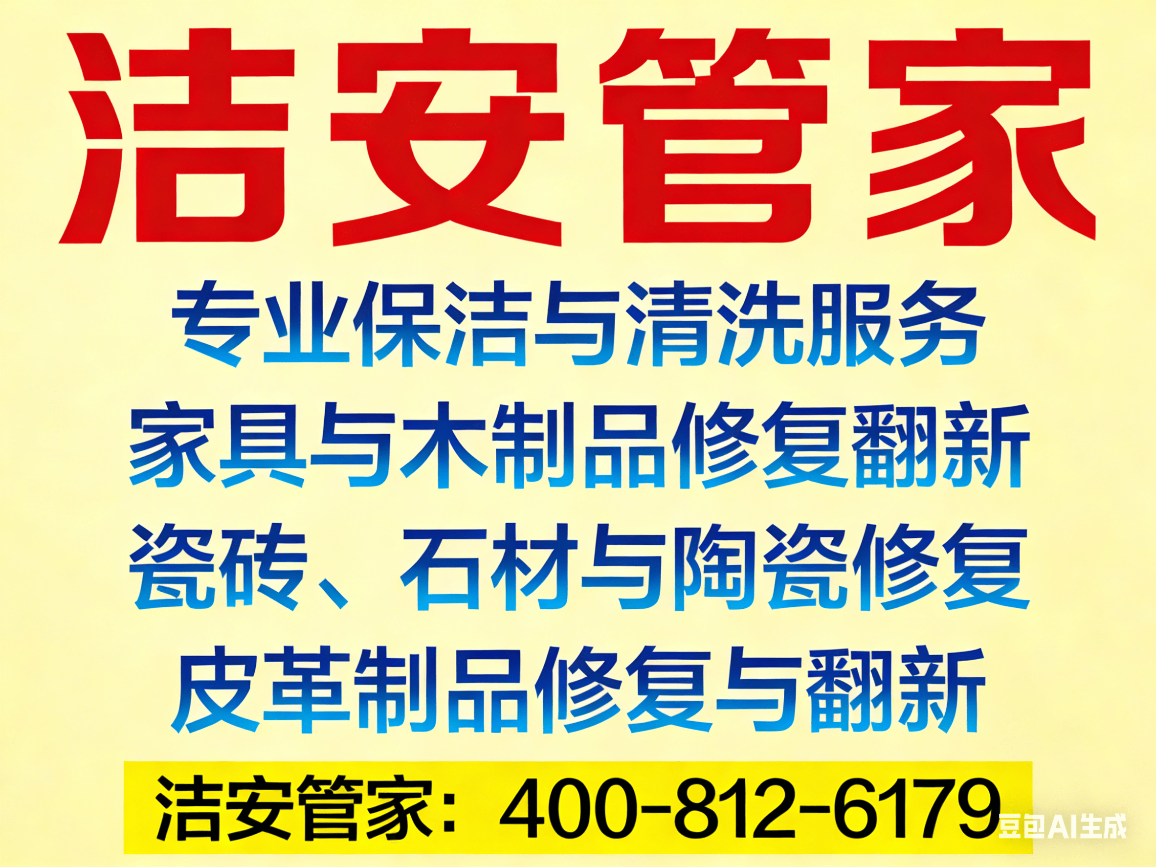高邮开荒保洁擦玻璃|家电清洗|地毯窗帘清洗|家具/瓷砖/沙发修复翻新|木器补漆|石材维修|皮具翻新热线咨询电话:洁安管家:400-812-6179【一键拨打提前预约办理更高效】。