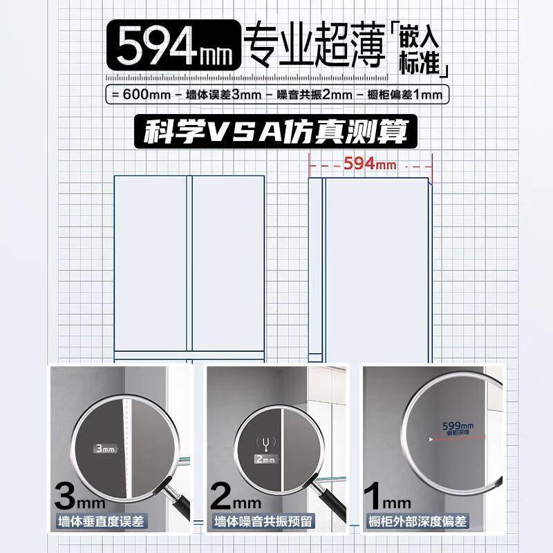 这款冰箱采用创新的"零嵌式"设计,通过精准的散热系统优化,实现了两侧仅需0.4cm空隙的极简安装。对比普通冰箱两侧各需预留10cm以上的散热空间,它为厨房节省了近20%的宝贵面积。门体90°直角开门设计,即使在狭窄过道也能完全打开,取物无死角。