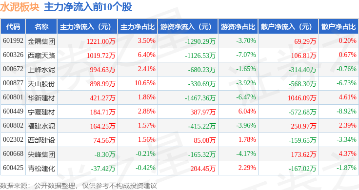 从资金流向上来看,当日水泥板块主力资金净流出1.66亿元,游资资金净流出3647.4万元,散户资金净流入2.02亿元。水泥板块个股资金流向见下表: