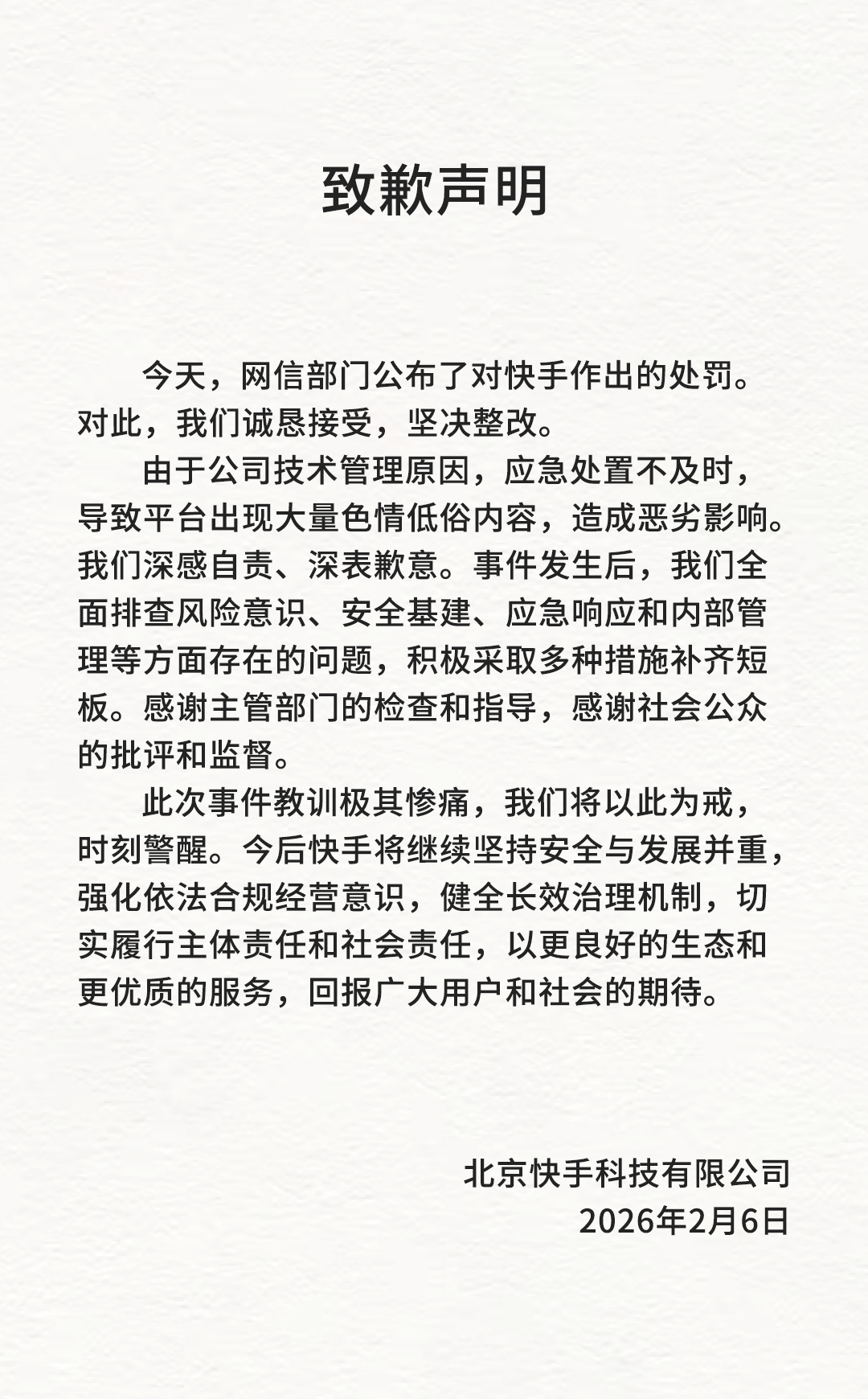 2月6日,“网信北京”发文公布网信部门对快手平台作出的处罚。