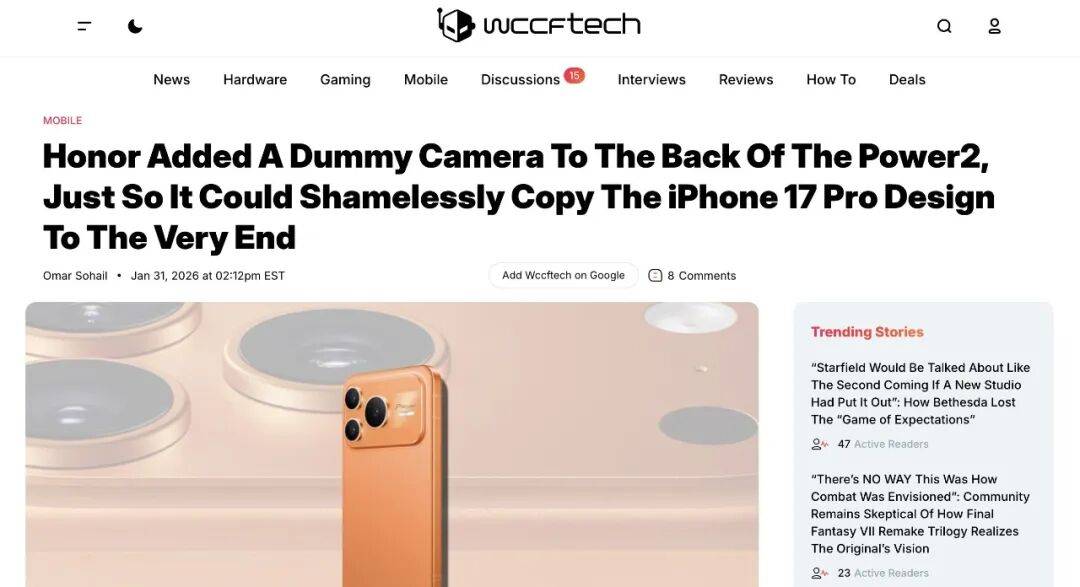 Wccftech等海外数码媒体很快跟进,火力甚至更猛,直接把说法从“接近”升级为“抄袭”,称荣耀Power2“无论外观还是系统,都在复制iPhone 17 Pro”。