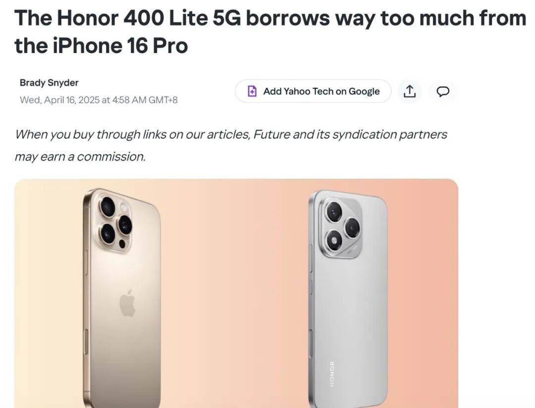 雅虎科技甚至在标题中直言不讳,称荣耀400 Lite 5G“借鉴了过多iPhone 16 Pro的设计元素”。