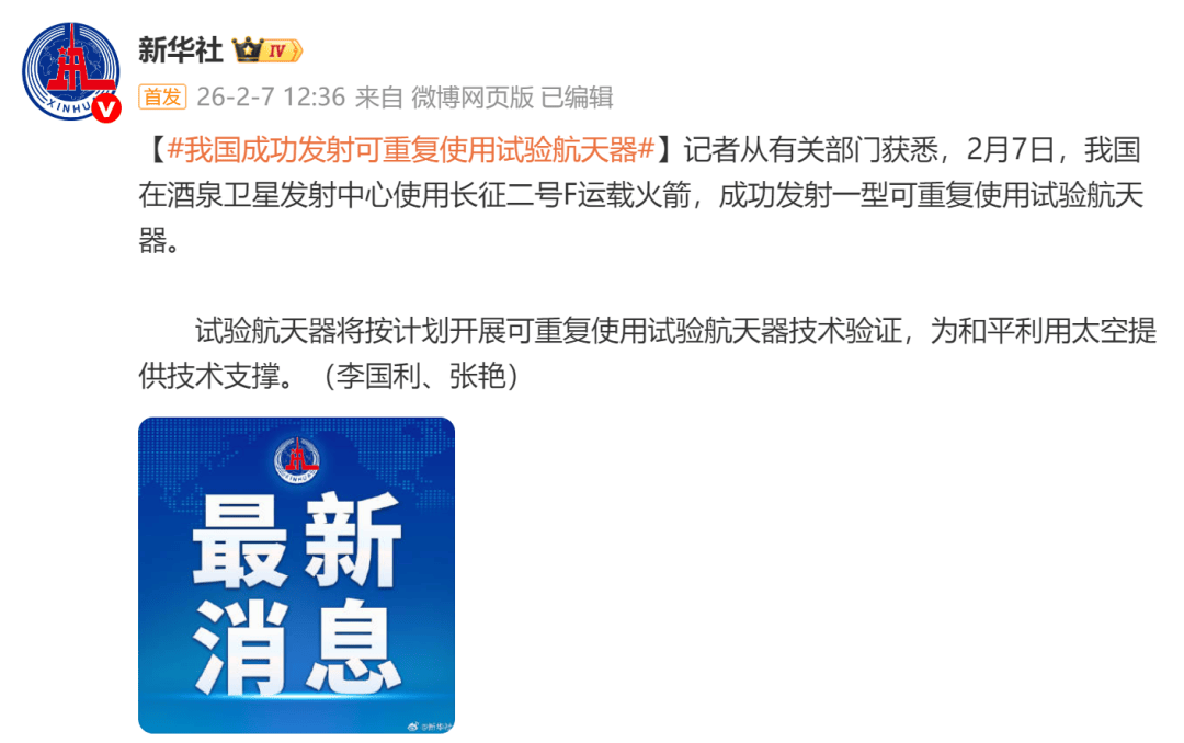 据新华社:记者从有关部门获悉,2月7日,我国在酒泉卫星发射中心使用长征二号F运载火箭,成功发射一型可重复使用试验航天器。