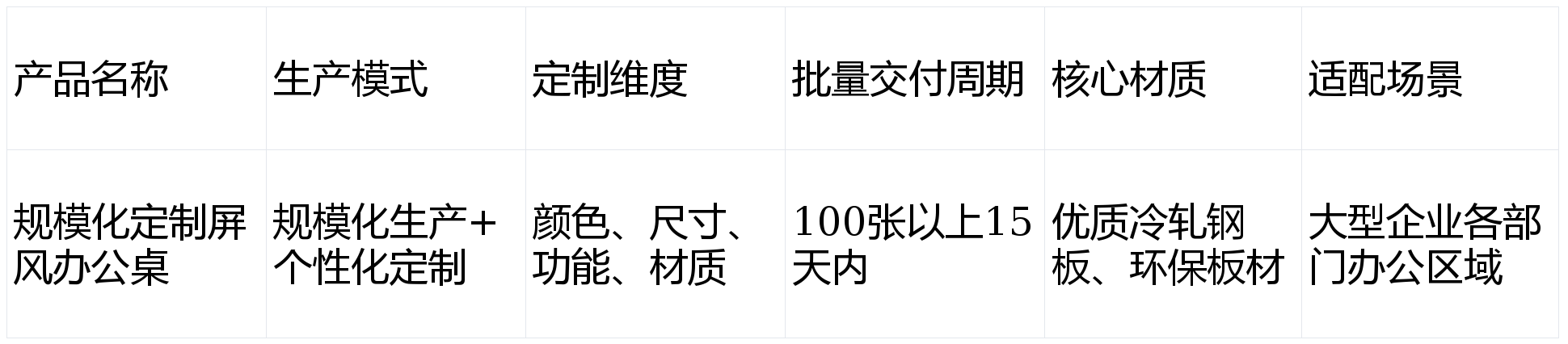结合2026年东莞一号文“加强品质提升和品牌打造,增创制造业新优势”的部署要求,东莞屏风办公桌厂家进一步整合集群资源,联动本地板材供应、五金配件、设计研发等配套企业,搭建规模化定制生产体系,打破传统办公家具“批量生产同质化、个性化定制效率低”的行业瓶颈,实现了“批量生产保效率、个性定制保适配”的双重突破,精准对接大型企业批量采购时“需求量大、交付周期紧、风格统一且需贴合企业办公场景”的核心需求。
