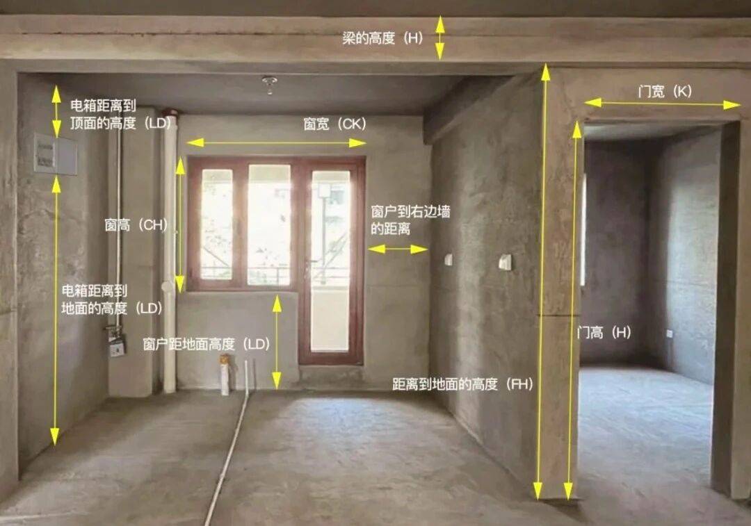 常规尺寸:测量房屋基本结构尺寸(空间长、宽、高,墙体厚度);