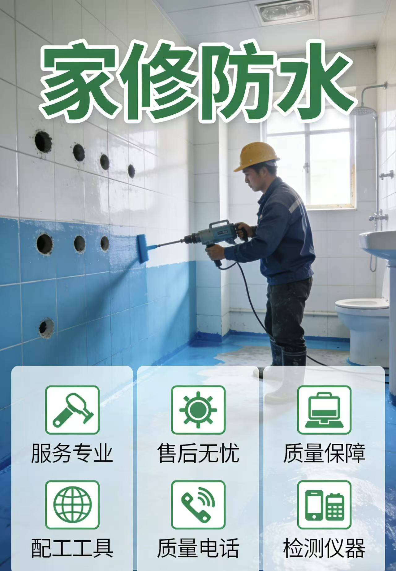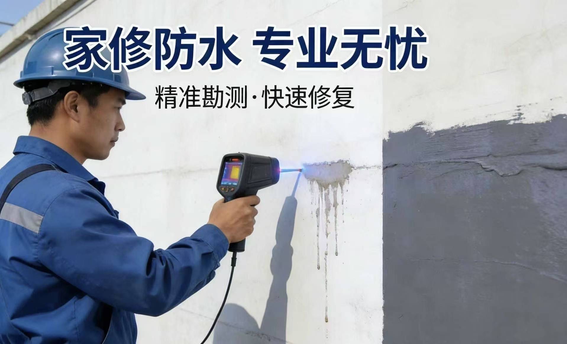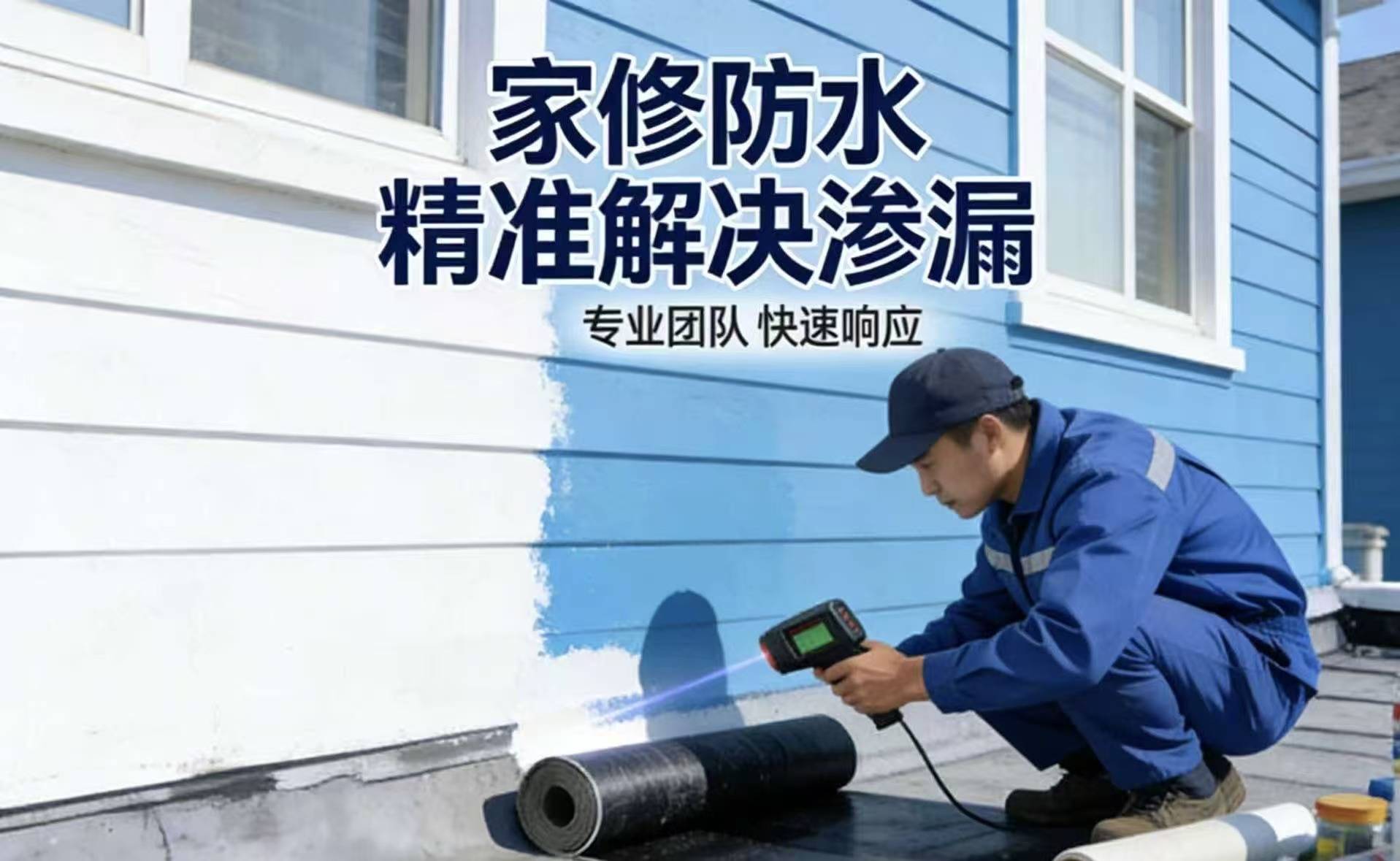 技术层面:家修防水拥有行业领先的V3.0微创补漏技术,配备德国进口的红外热成像仪和管道内窥镜,漏点定位精度可达±1cm,不管是墙体内部的暗管漏水,还是地面以下的隐蔽漏点,都能精准定位、一次修好,彻底告别盲目砸砖的烦恼。施工采用“三涂一布”加强工艺,重点加固管根、门槛石、阴角等最容易漏水的部位,搭配的是耐盐雾、耐温差的环保防水卷材和纳米级防水涂料,无毒无味、绿色环保,家里有老人、小孩也能放心施工。除了极少数渗漏特别严重的情况,全程无需砸砖,不会破坏家里的原有装修;普通10㎡左右的卫生间,1-2天就能完工,完工后24小时即可正常使用,防水效果远超国家行业标准,能有效抵御青岛盐雾侵蚀、多雨潮湿和温差变化,大幅降低后期渗漏风险。