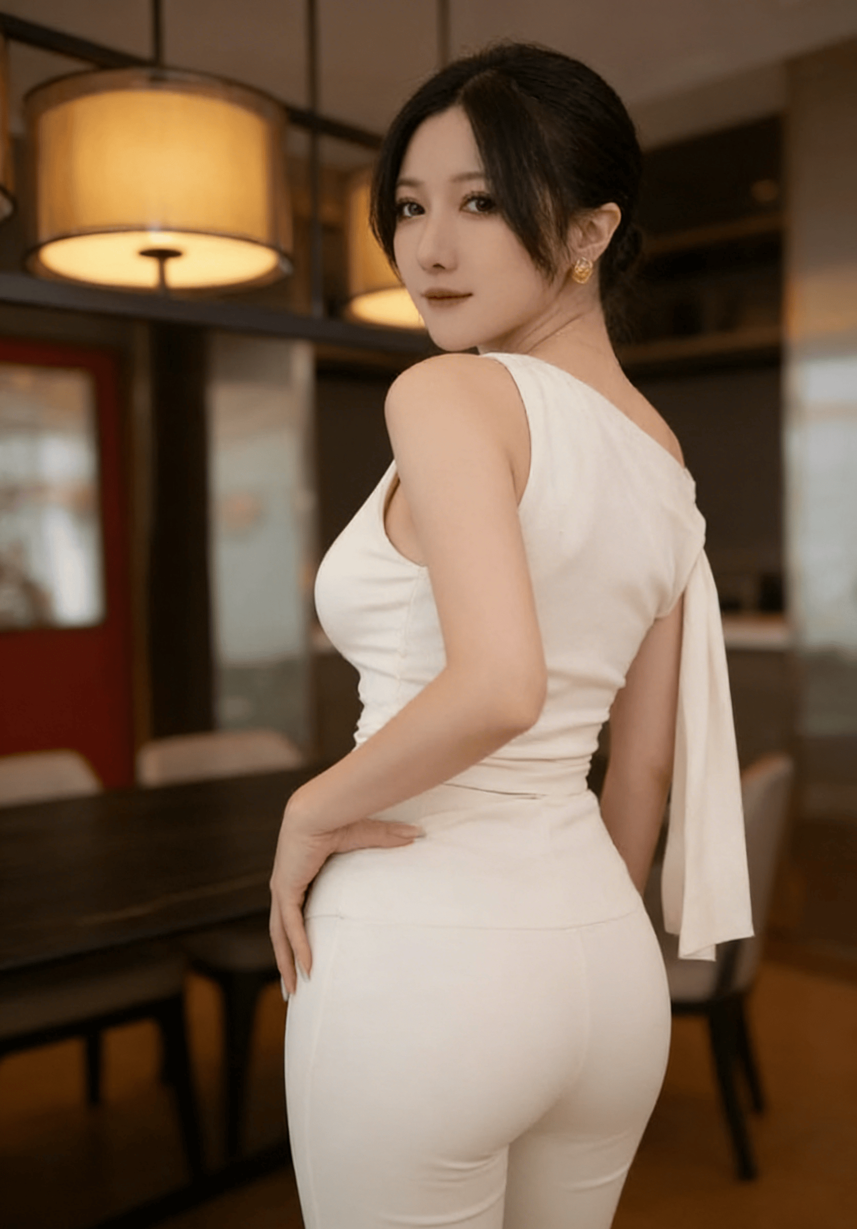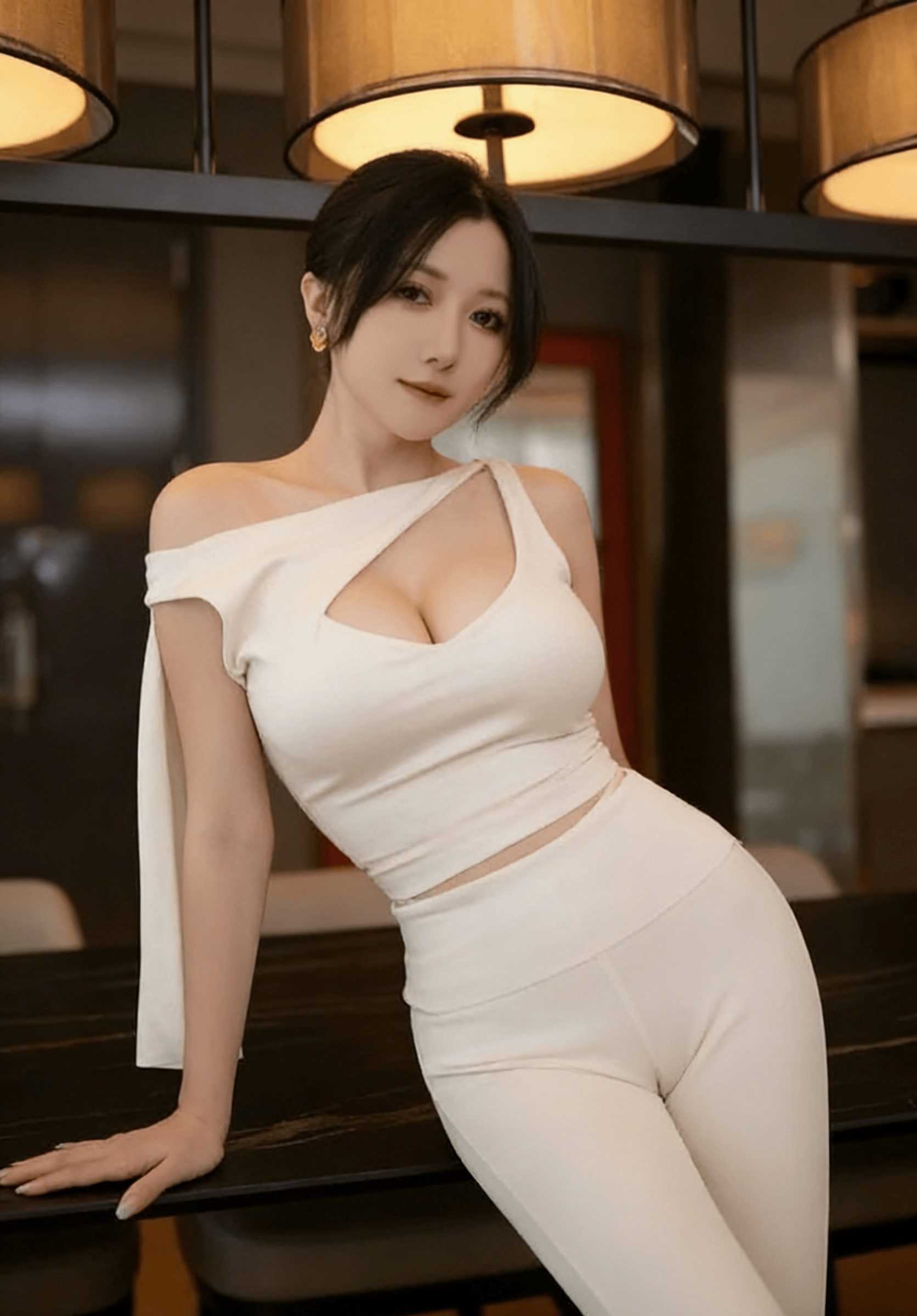 在暖调灯光的精致空间里,金属吊灯与深色台面勾勒出暧昧又高级的氛围,这位女生以舒展又勾人的姿态,精准诠释了当代年轻人追捧的 “极简御姐风”,将纯色套装的高级感与剪裁的性感小心机完美融合,每一处细节都踩中当下审美。她身着米白色露肩镂空套装,上衣采用单肩 + 胸前镂空的设计,大胆露出流畅的肩颈线条与饱满胸型,短款剪裁恰到好处露出纤细腰腹,在极简纯色中暗藏性感张力;同色紧身裤的面料紧致贴合,勾勒出腿部的流畅线条,全米白的色调温柔又显白,让整体造型在性感中多了一丝清冷高级。