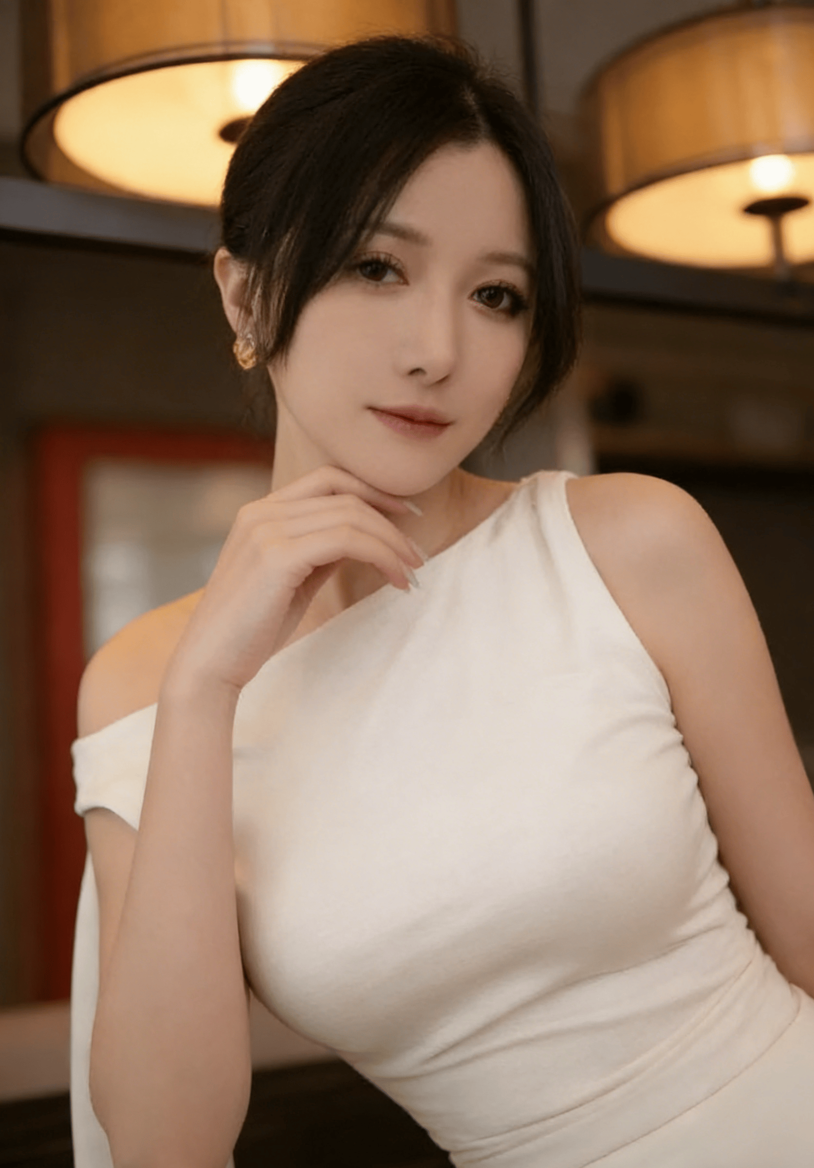 她侧身倚靠在深色台面上,一手轻搭台面,身体线条舒展又充满镜头感,黑长发盘起,金色耳饰为整体增添了一丝精致感,暖调光线的加持让米白面料泛着细腻光泽,背景的金属吊灯与深色家具强化了高级氛围,眼神温柔又带着一丝勾人,完美拿捏 “极简御姐” 的气质。
