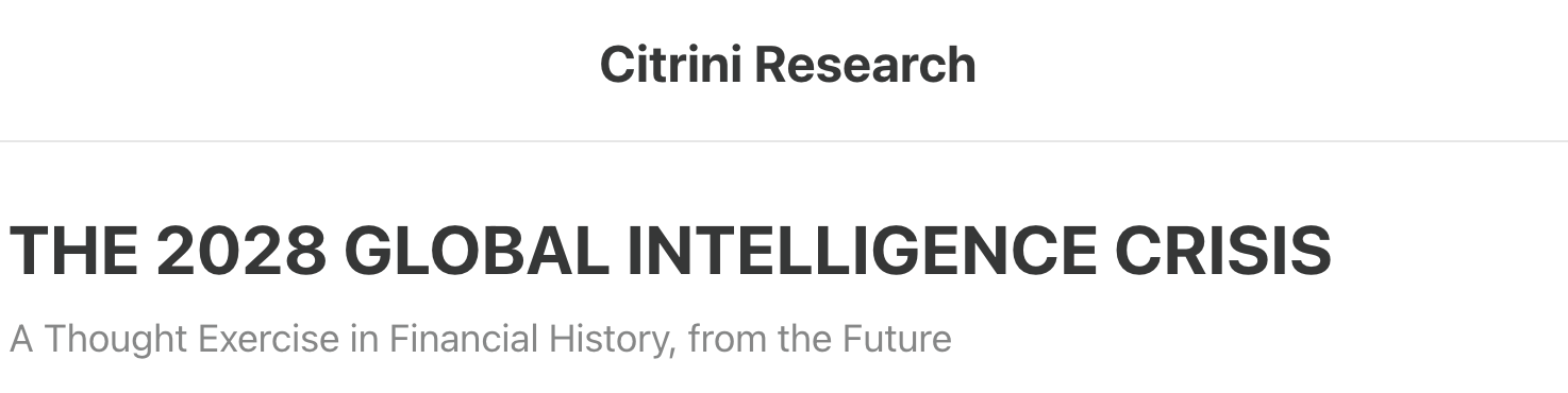 一篇关于未来AI对经济影响的假设性报告近两天走红网络,直接引发美股多个板块下跌。这篇报告源于投资研究机构Citrini Research,名为《2028年全球智能危机》(The 2028 Global Intelligence Crisis)。