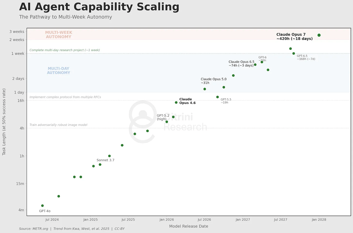 今天,AI Agent 可处理过去要数周的研发任务。这条指数曲线碾过我们对可能性的想像,尽管每年都有 Wharton 教授试图再用一条新 S 曲线去拟合资料。