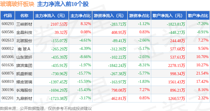 从资金流向上来看,当日玻璃玻纤板块主力资金净流出13.89亿元,游资资金净流入2.4亿元,散户资金净流入11.49亿元。玻璃玻纤板块个股资金流向见下表: