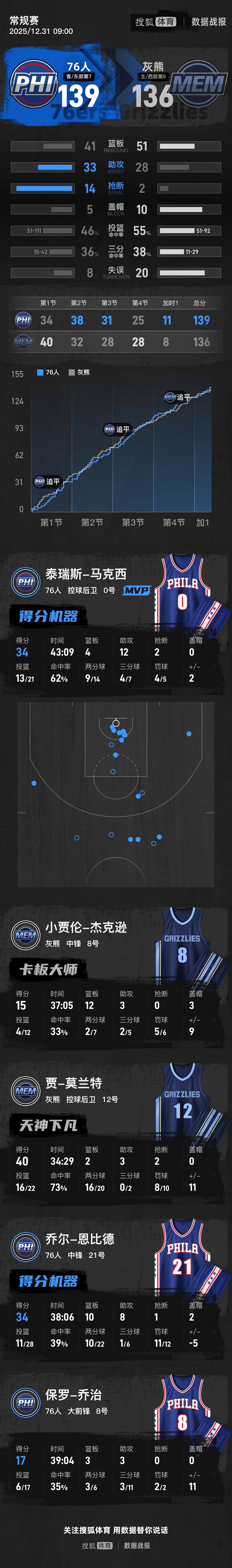 【搜狐体育战报】北京时间12月31日NBA常规赛,客场作战的76人以139-136加时击败灰熊。马克西34分4篮板12助攻,考沃德28分16篮板4助攻。