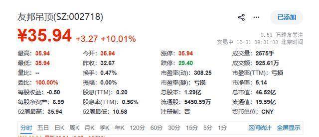 12月31日,友邦吊顶(002718.SZ)复牌涨停,报35.94元/股,总市值为46.52亿元。