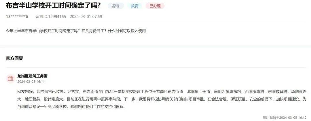 针对上述反映,深圳市龙岗区建筑工务署回复称,半山九年一贯制学校新建工程受周边条件限制,施工通道欠缺,此前受此影响短暂停工。目前,该署已将此问题报请区政府审议并确定了相关解决方案,拟借用大龙物流园侧用地作为新的施工临时通道,并已与大龙物流园沟通达成一致意见。
