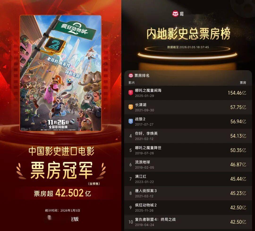 据票务平台数据统计,电影《疯狂动物城2》累计票房(含预售)突破42.502亿,超《复仇者联盟4:终局之战》票房成绩,成为中国影史进口片票房冠军,同时进入中国影史电影票房榜前九。