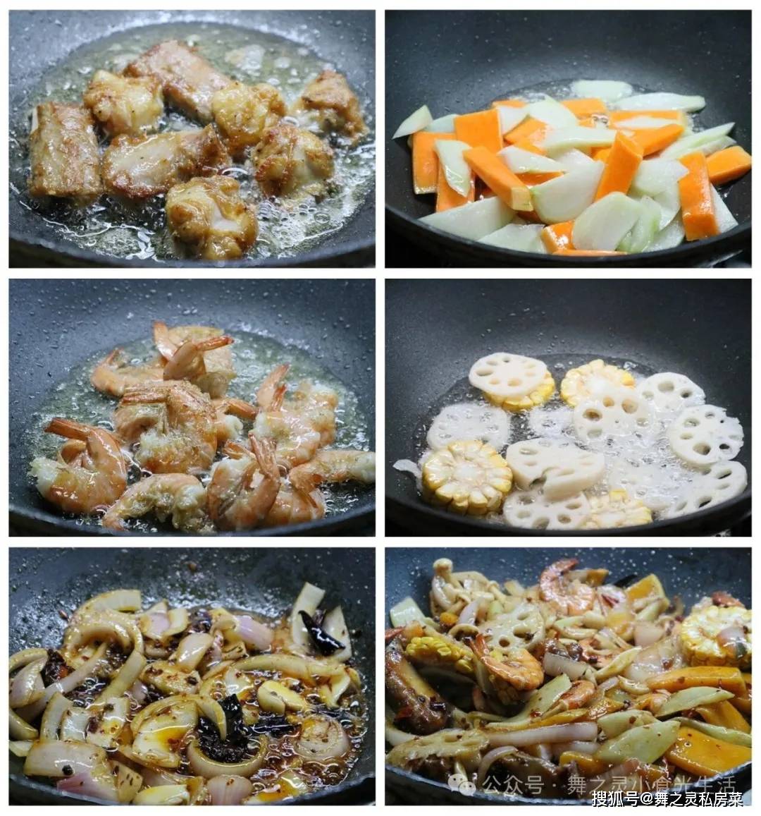 2、锅烧热同时油多倒入一些,把玉米莲藕放入油锅大概1分钟捞出来沥干油;接着把南瓜和佛手瓜也放入过油,同样1分钟后捞出来。然后虾也放入油炸变色就可以;同样的软排和翅中也放入炸熟,捞出来。