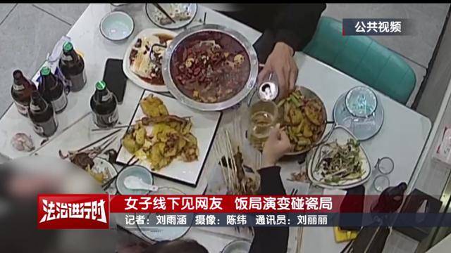 画面显示,两名黑衣男子,和王女士来到餐厅,坐下来先点了6瓶啤酒,菜还没上,男子就开始给王女士倒酒了,紧接着劝酒。整个就餐过程,两名男子频繁与王女士碰杯。