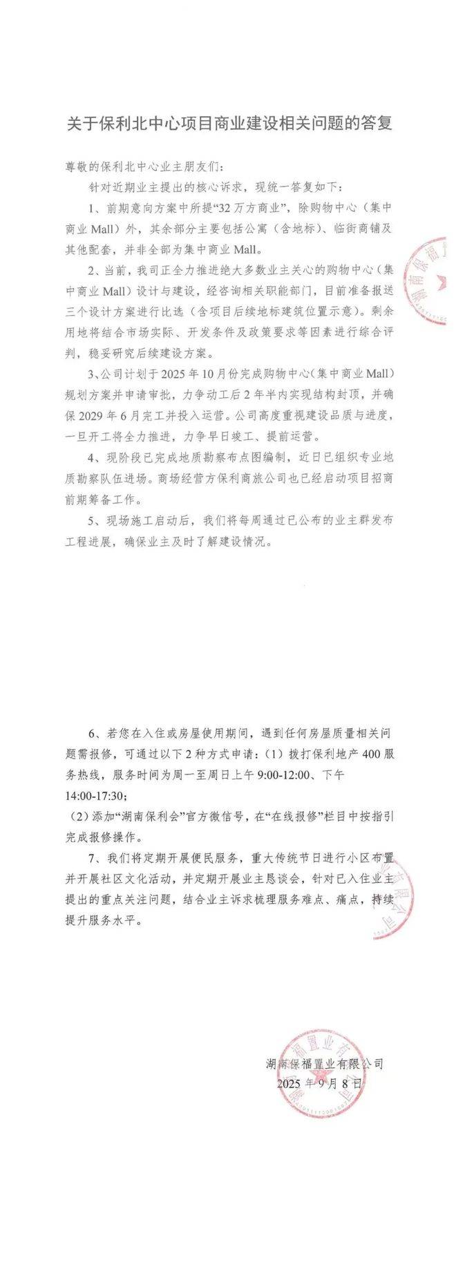 今年9月份,保利方面曾告知业主商业地块的建设情况: