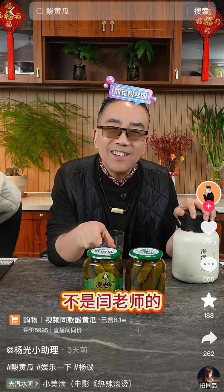 演员闫学晶风波发生后,意外带动“酸黄瓜”产品的关注度。已故相声演员杨少华之子杨议也在直播平台带货酸黄瓜,有网友认为他是在蹭流量。